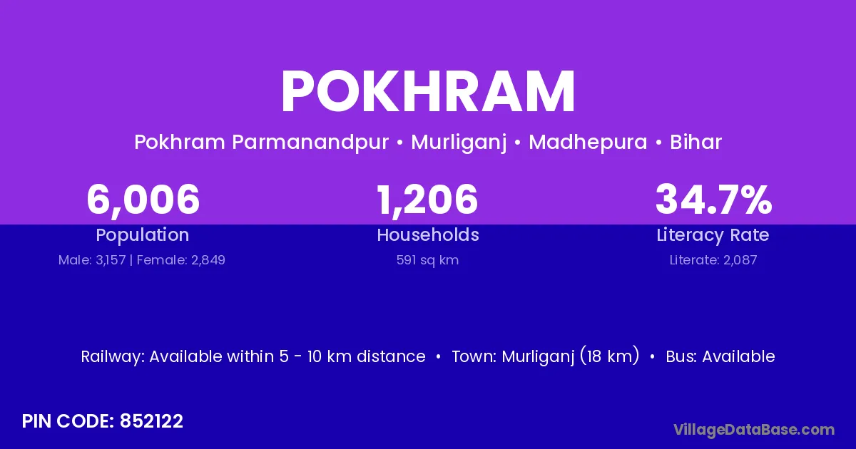 Murliganj (18 km) is the nearest town to Pokhram village for major economic activities and is located approximately 18 km away.
