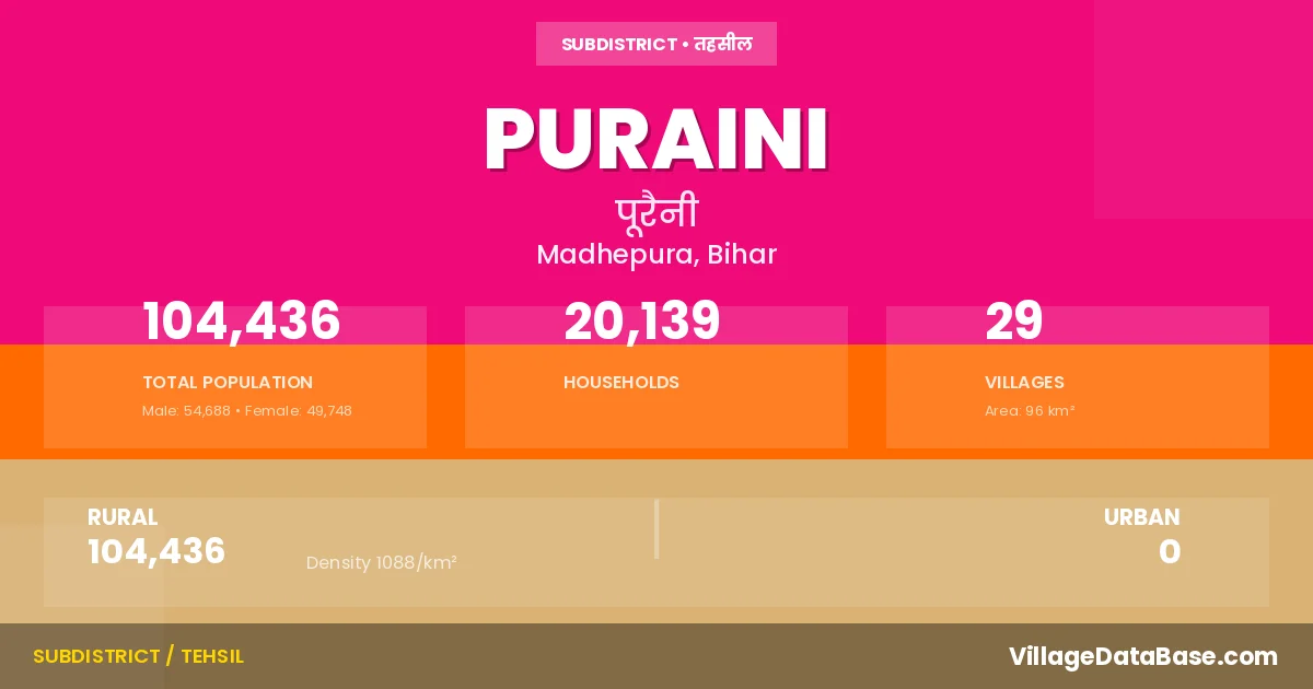 Puraini is a town and Subdivision in the Madhepura district of the Bihar. In India, a Subdivision is a subdivision of a district responsible for the administration and revenue collection of a specific area within the district. Subdivisions play a crucial role in the local governance structure, contributing significantly to the development and administration of their communities.