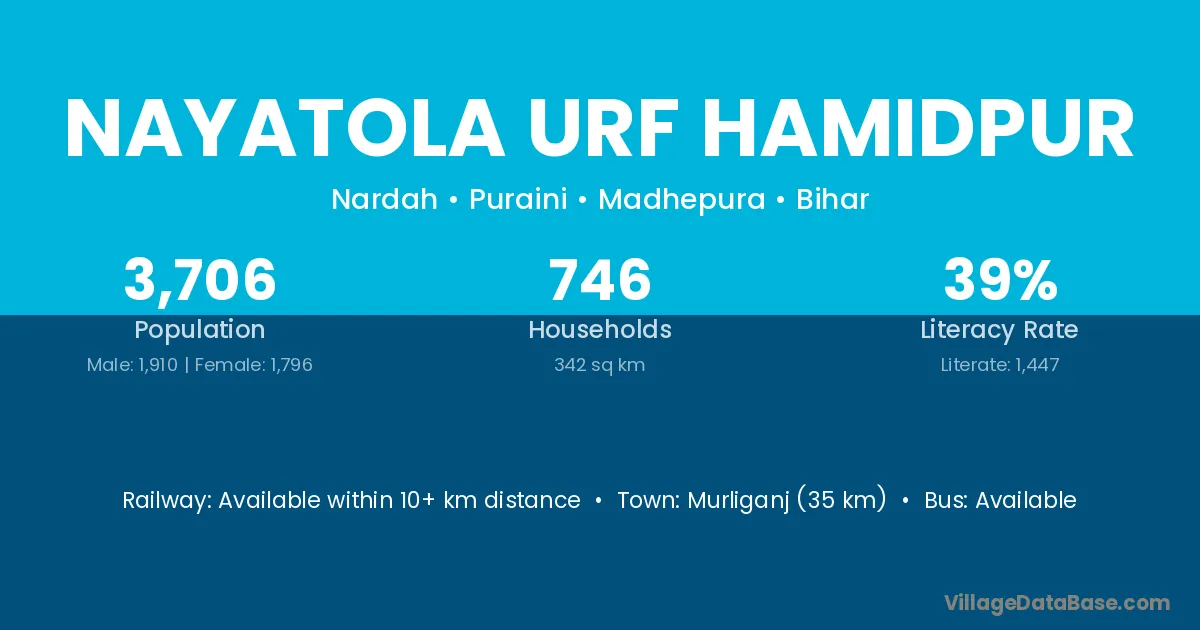 Murliganj (35 km) is the nearest town to Nayatola Urf Hamidpur village for major economic activities and is located approximately 35 km away.