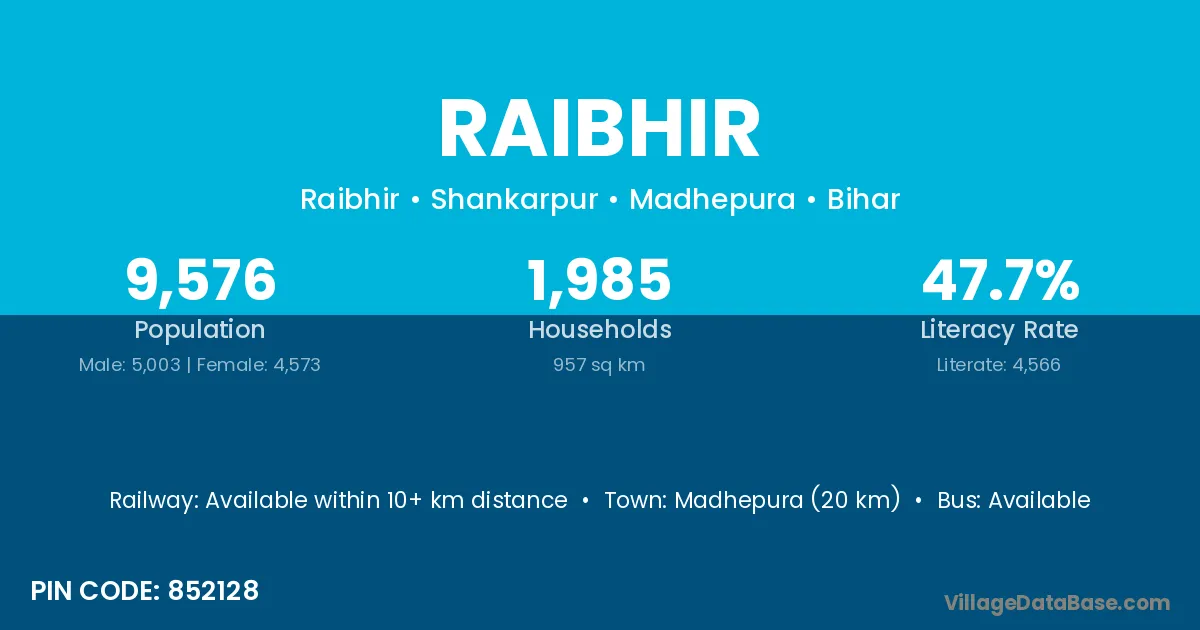 Madhepura (20 km) is the nearest town to Raibhir village for major economic activities and is located approximately 20 km away.