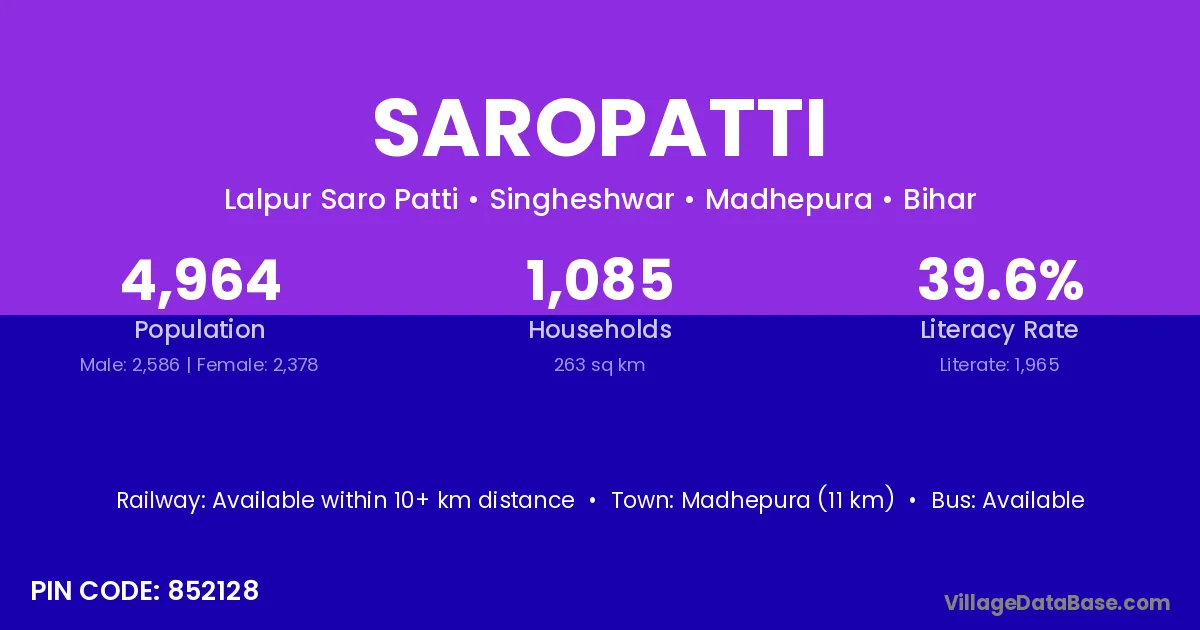 Madhepura (11 km) is the nearest town to Saropatti village for major economic activities and is located approximately 11 km away.