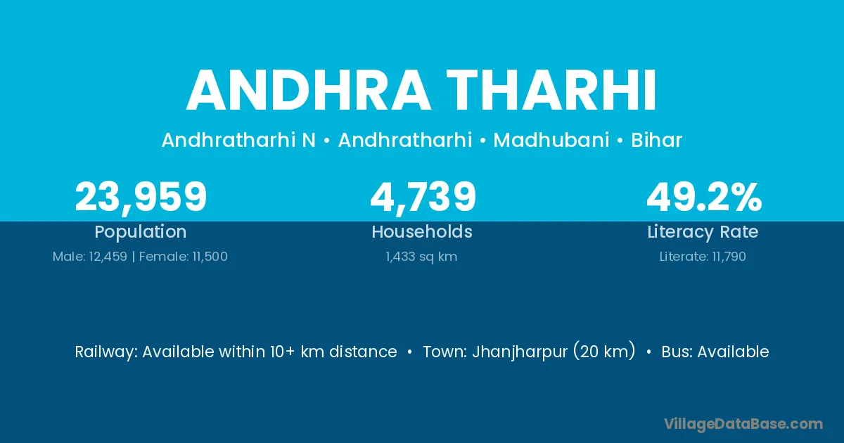 Jhanjharpur (20 km) is the nearest town to Andhra Tharhi village for major economic activities and is located approximately 20 km away.