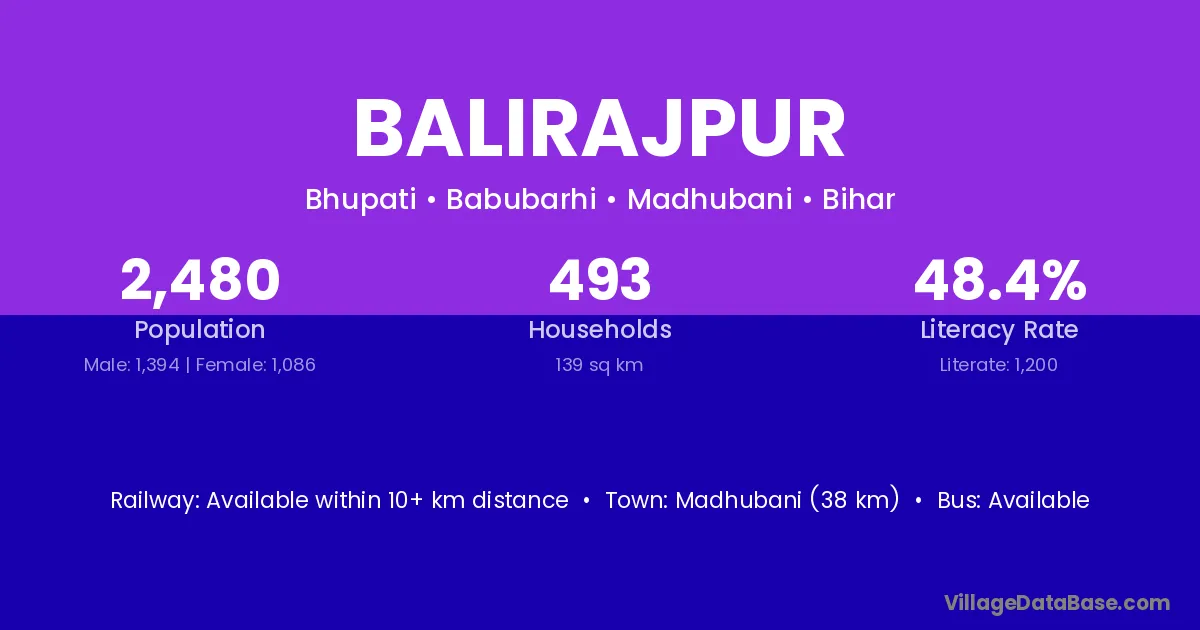 Madhubani (38 km) is the nearest town to Balirajpur village for major economic activities and is located approximately 38 km away.