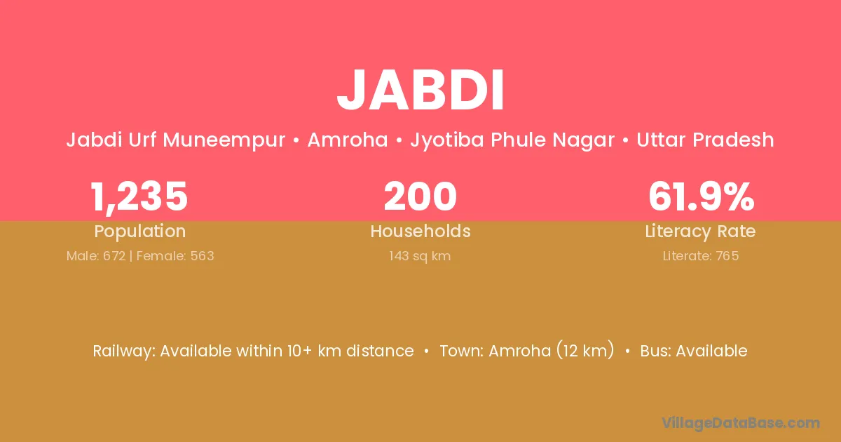 The literacy rate of Jabdi village is 54.68%. Male literacy stands at 68.73% and female literacy at 39.79%.