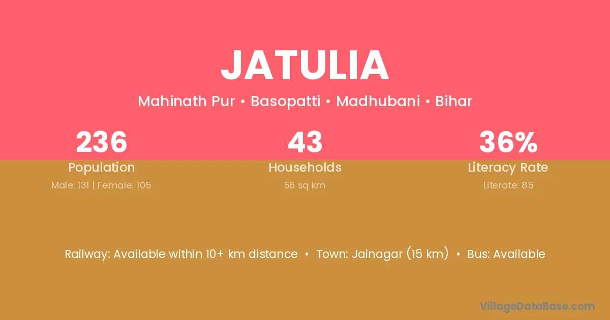 Jainagar (15 km) is the nearest town to Jatulia village for major economic activities and is located approximately 15 km away.