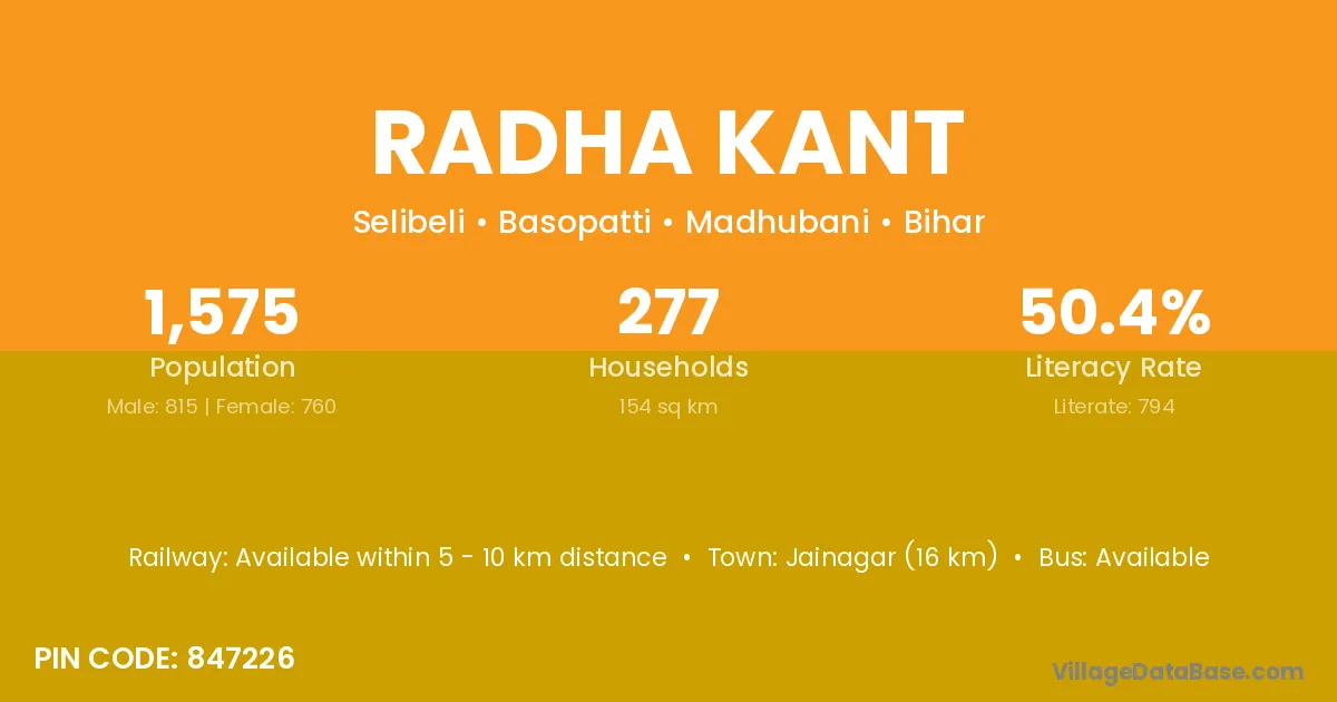 Jainagar (16 km) is the nearest town to Radha Kant village for major economic activities and is located approximately 16 km away.