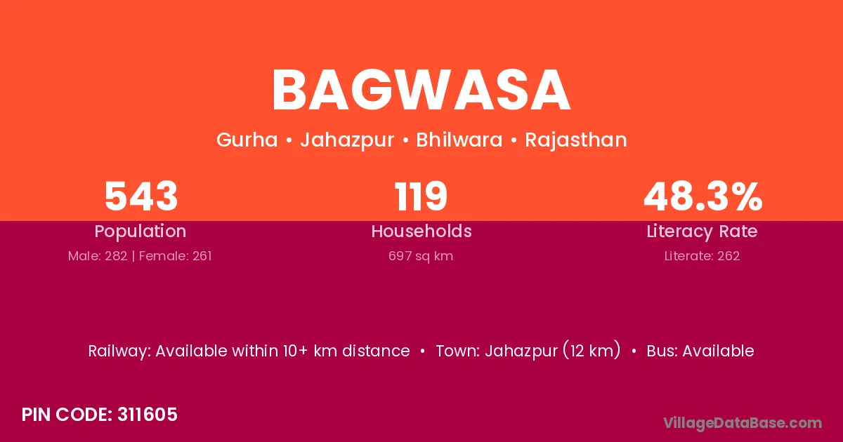 Bagwasa village has a total population of 1,737 people, of which 880 are males and 857 are females.
