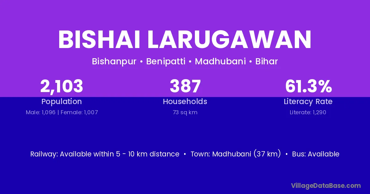 Madhubani (37 km) is the nearest town to Bishai Larugawan village for major economic activities and is located approximately 37 km away.