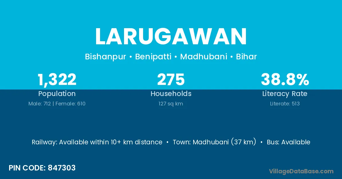 Madhubani (37 km) is the nearest town to Larugawan village for major economic activities and is located approximately 37 km away.