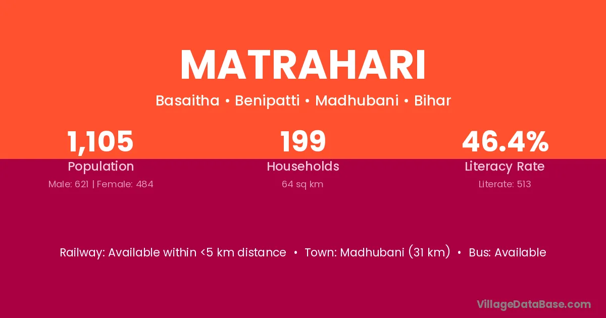 Madhubani (31 km) is the nearest town to Matrahari village for major economic activities and is located approximately 31 km away.