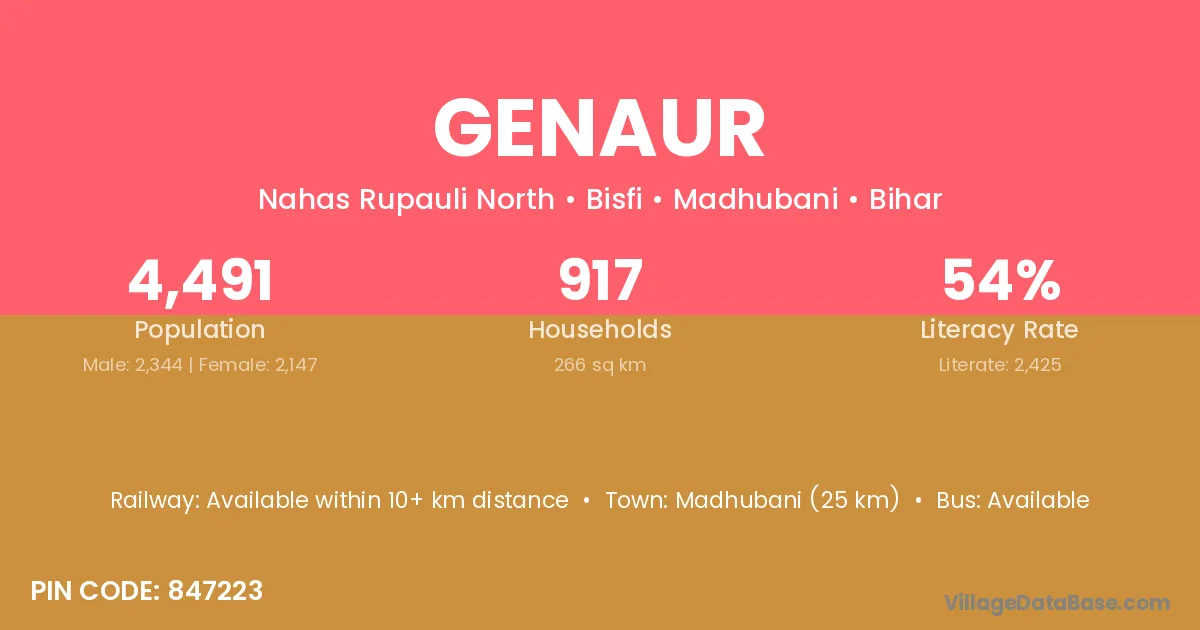Madhubani (25 km) is the nearest town to Genaur village for major economic activities and is located approximately 25 km away.