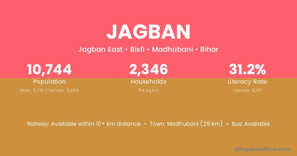Madhubani (29 km) is the nearest town to Jagban village for major economic activities and is located approximately 29 km away.