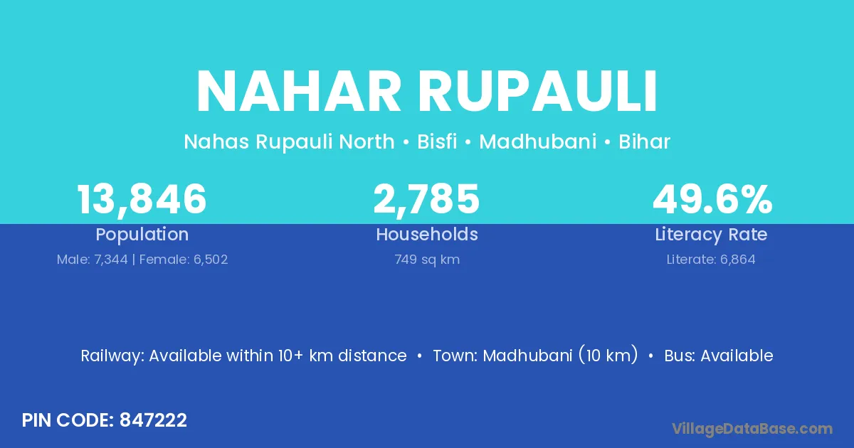 Madhubani (10 km) is the nearest town to Nahar Rupauli village for major economic activities and is located approximately 10 km away.