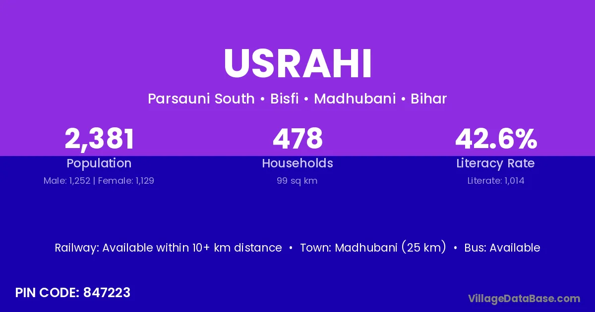 Madhubani (25 km) is the nearest town to Usrahi village for major economic activities and is located approximately 25 km away.