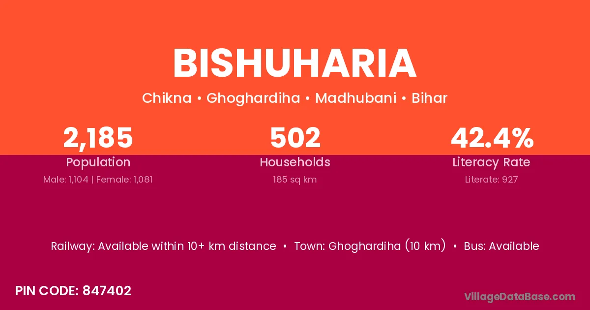 Ghoghardiha (10 km) is the nearest town to Bishuharia village for major economic activities and is located approximately 10 km away.
