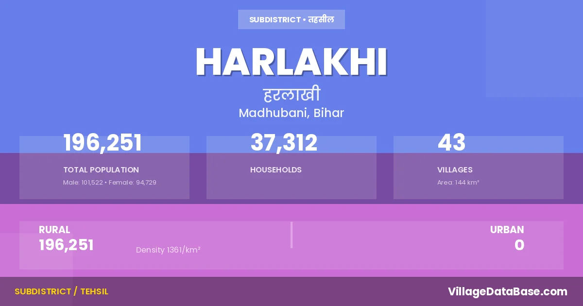 Harlakhi is a town and Subdivision in the Madhubani district of the Bihar. In India, a Subdivision is a subdivision of a district responsible for the administration and revenue collection of a specific area within the district. Subdivisions play a crucial role in the local governance structure, contributing significantly to the development and administration of their communities.