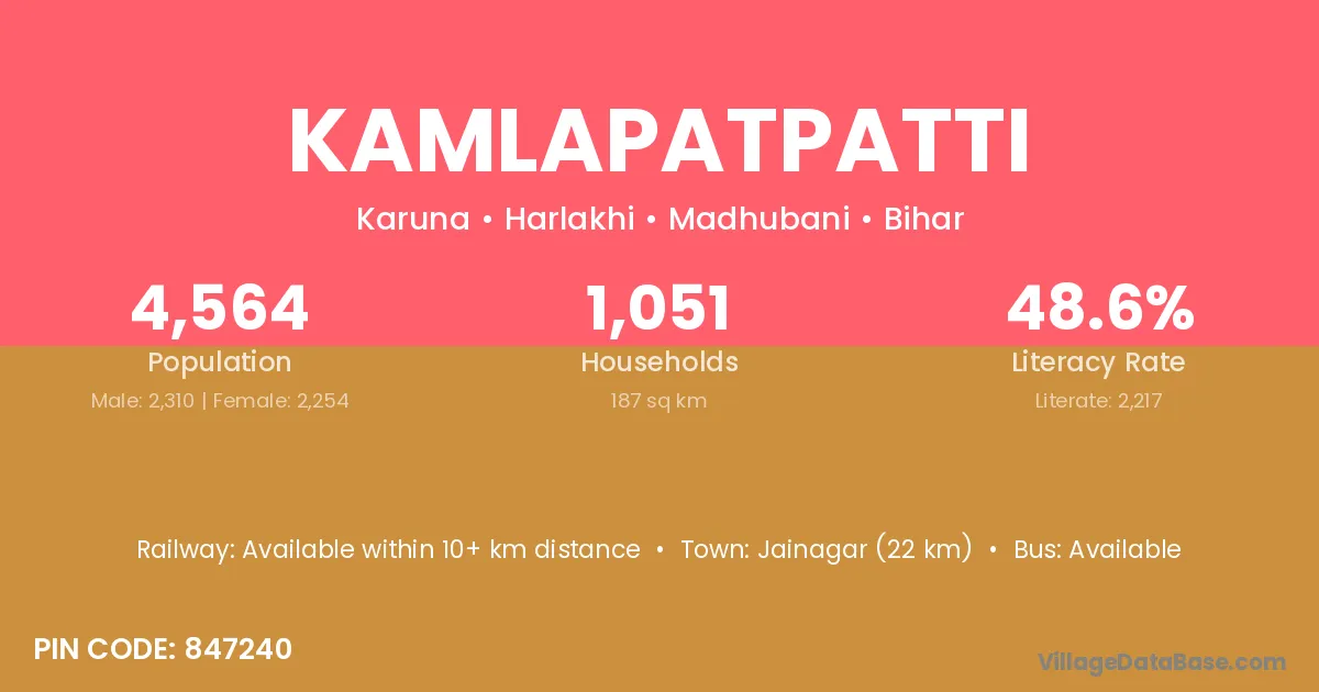 Jainagar (22 km) is the nearest town to Kamlapatpatti village for major economic activities and is located approximately 22 km away.