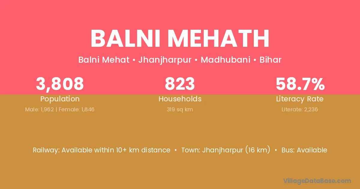 Jhanjharpur (16 km) is the nearest town to Balni Mehath village for major economic activities and is located approximately 16 km away.