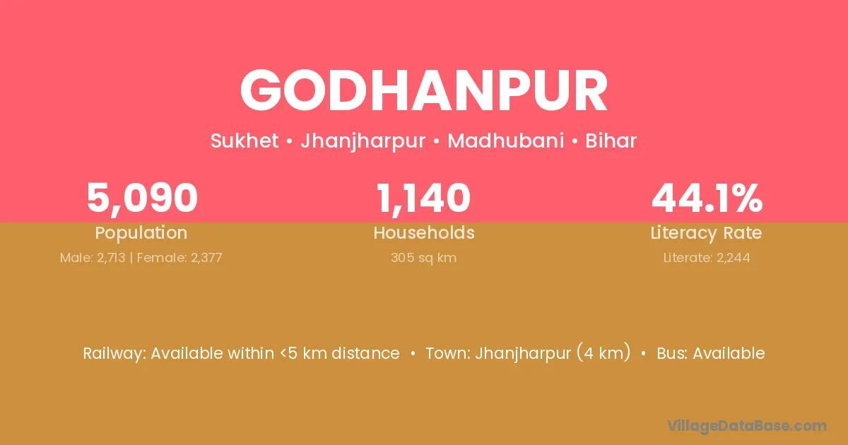 Jhanjharpur (4 km) is the nearest town to Godhanpur village for major economic activities and is located approximately 4 km away.