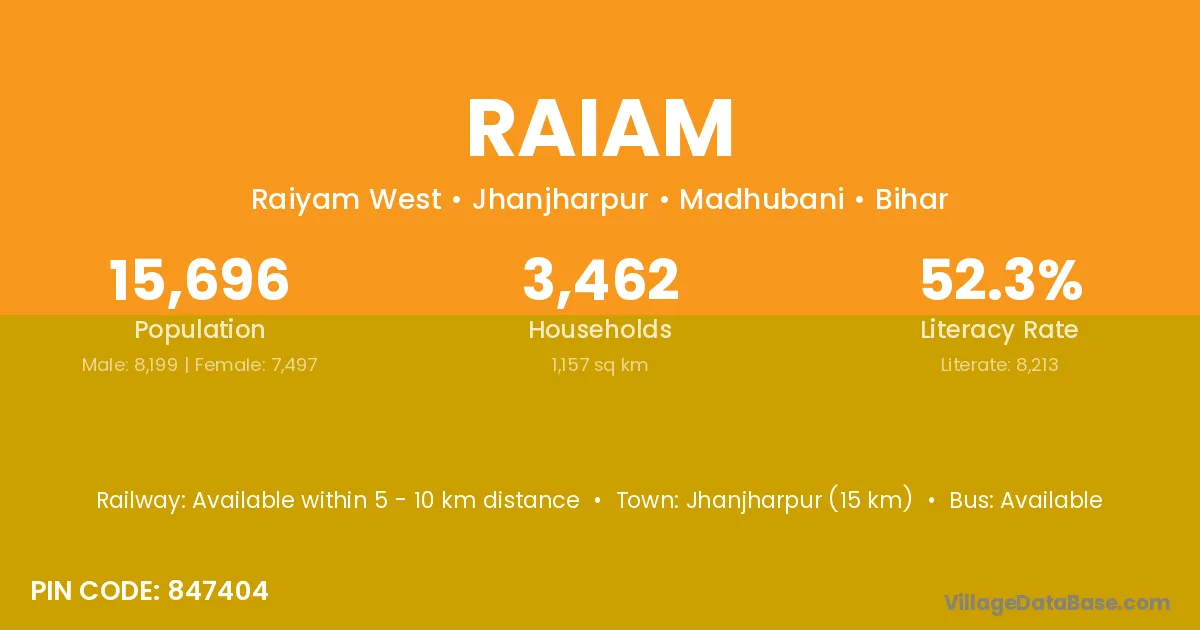 Jhanjharpur (15 km) is the nearest town to Raiam village for major economic activities and is located approximately 15 km away.