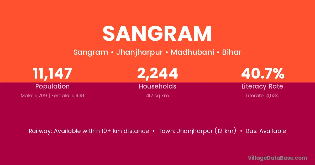 Jhanjharpur (12 km) is the nearest town to Sangram village for major economic activities and is located approximately 12 km away.