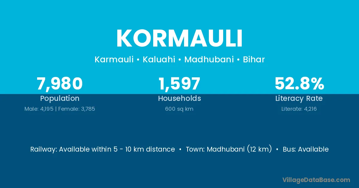 Madhubani (12 km) is the nearest town to Kormauli village for major economic activities and is located approximately 12 km away.