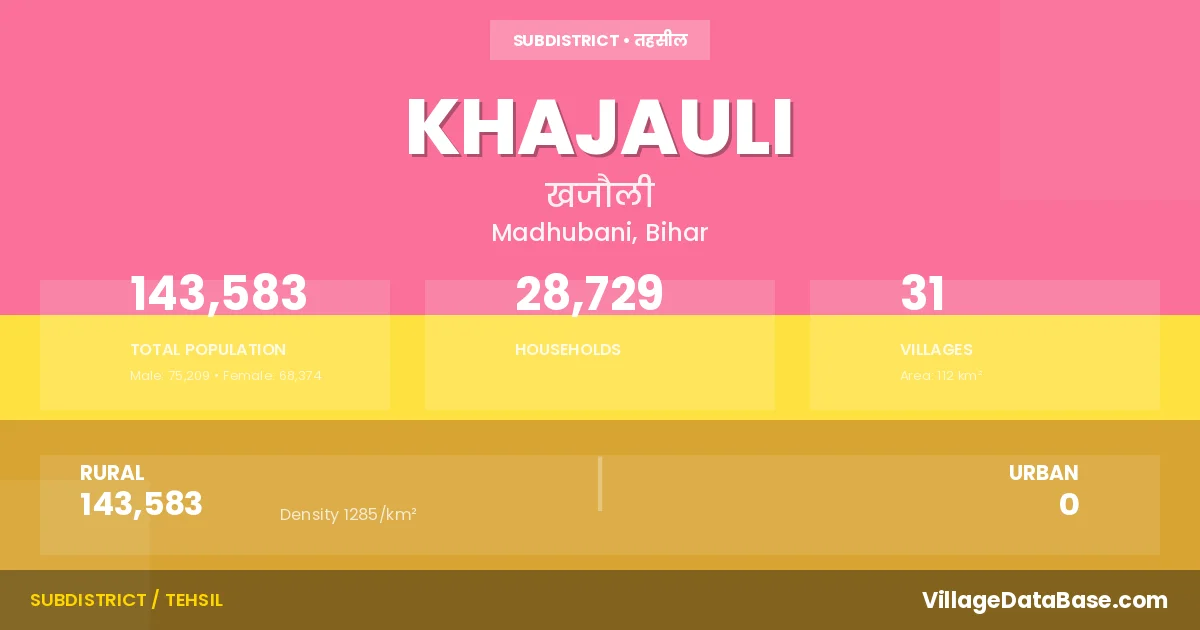 According to the 2011 census The total area of Khajauli Subdivision is 112 km², with a population of 143583 people. The population density is 1,285 inhabitants per square kilometre, and there are approximately 28729 houses in the sub district.