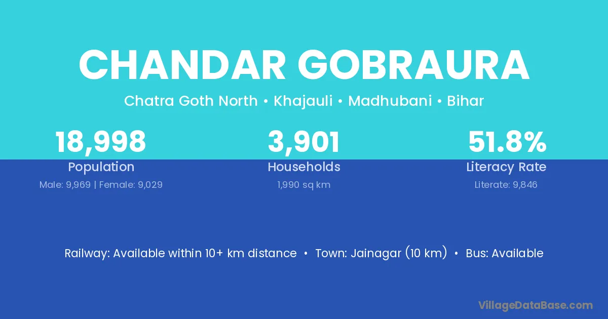 Chandar Gobraura village has a total population of 18,998 people, of which 9,969 are males and 9,029 are females.