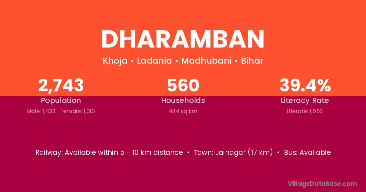 Jainagar (17 km) is the nearest town to Dharamban village for major economic activities and is located approximately 17 km away.