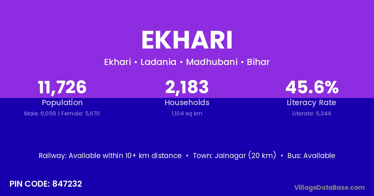 Jainagar (20 km) is the nearest town to Ekhari village for major economic activities and is located approximately 20 km away.