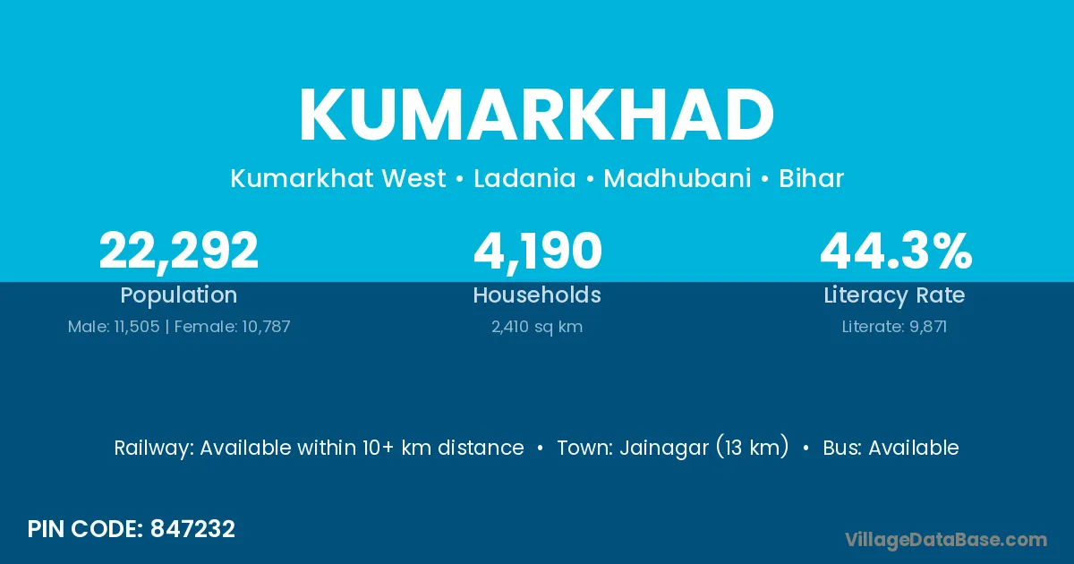 Jainagar (13 km) is the nearest town to Kumarkhad village for major economic activities and is located approximately 13 km away.