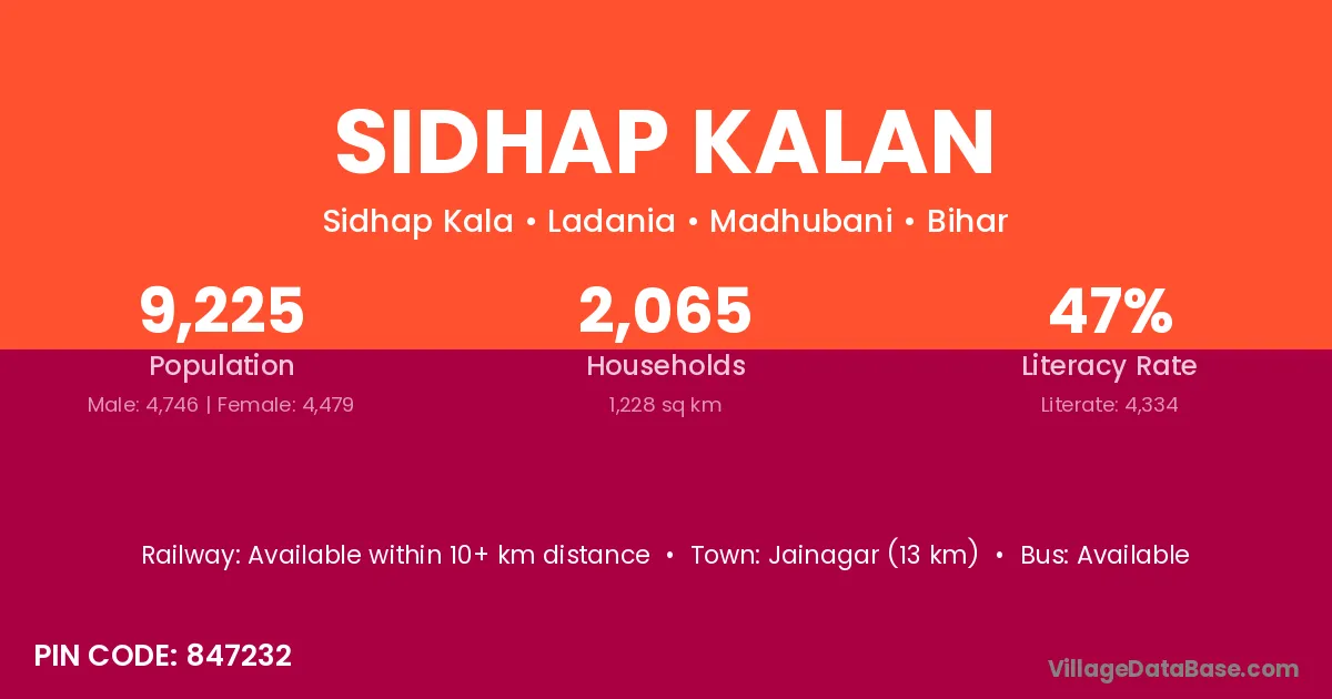 Jainagar (13 km) is the nearest town to Sidhap Kalan village for major economic activities and is located approximately 13 km away.