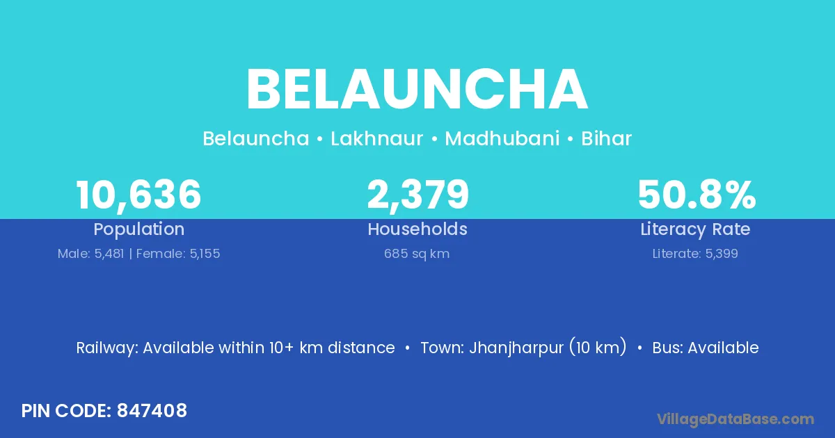 Jhanjharpur (10 km) is the nearest town to Belauncha village for major economic activities and is located approximately 10 km away.