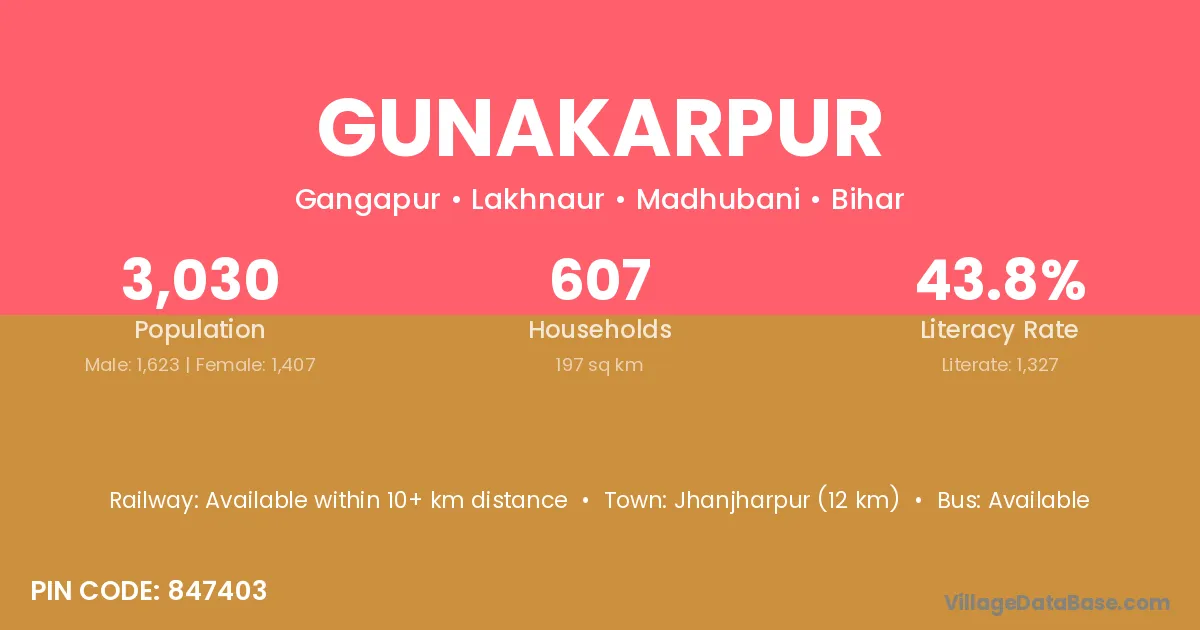 Jhanjharpur (12 km) is the nearest town to Gunakarpur village for major economic activities and is located approximately 12 km away.