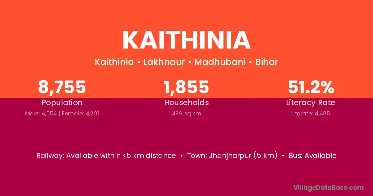 Jhanjharpur (5 km) is the nearest town to Kaithinia village for major economic activities and is located approximately 5 km away.