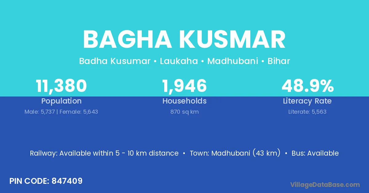 Madhubani (43 km) is the nearest town to Bagha Kusmar village for major economic activities and is located approximately 43 km away.