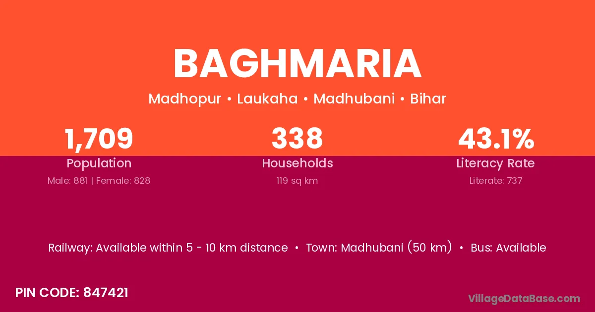 Madhubani (50 km) is the nearest town to Baghmaria village for major economic activities and is located approximately 50 km away.