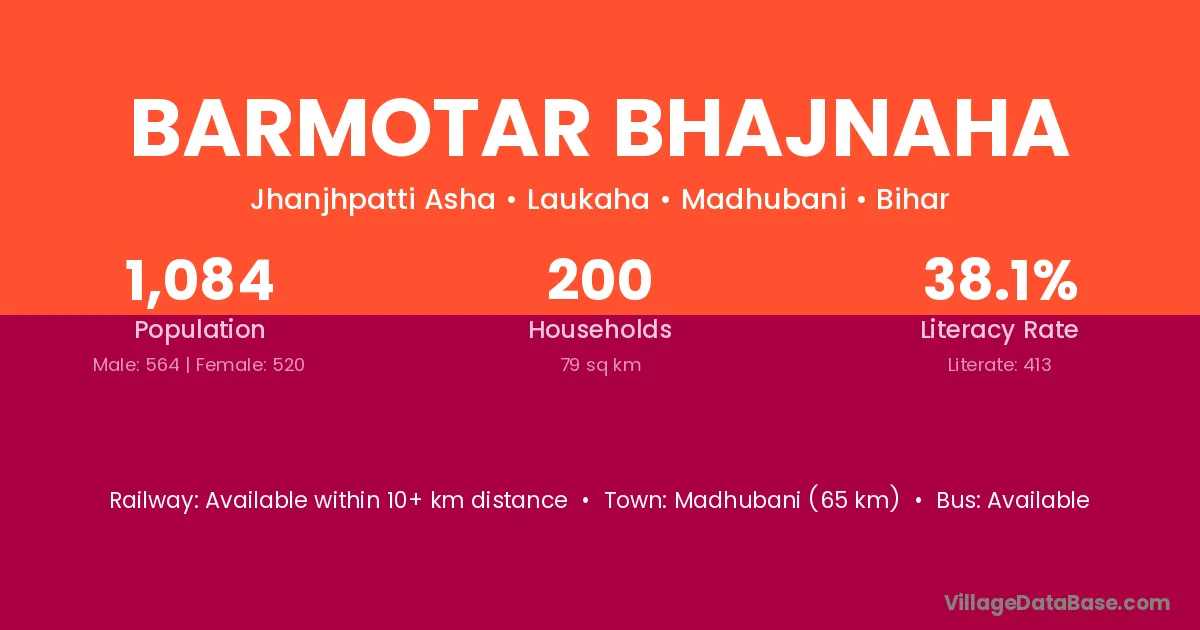 Madhubani (65 km) is the nearest town to Barmotar Bhajnaha village for major economic activities and is located approximately 65 km away.