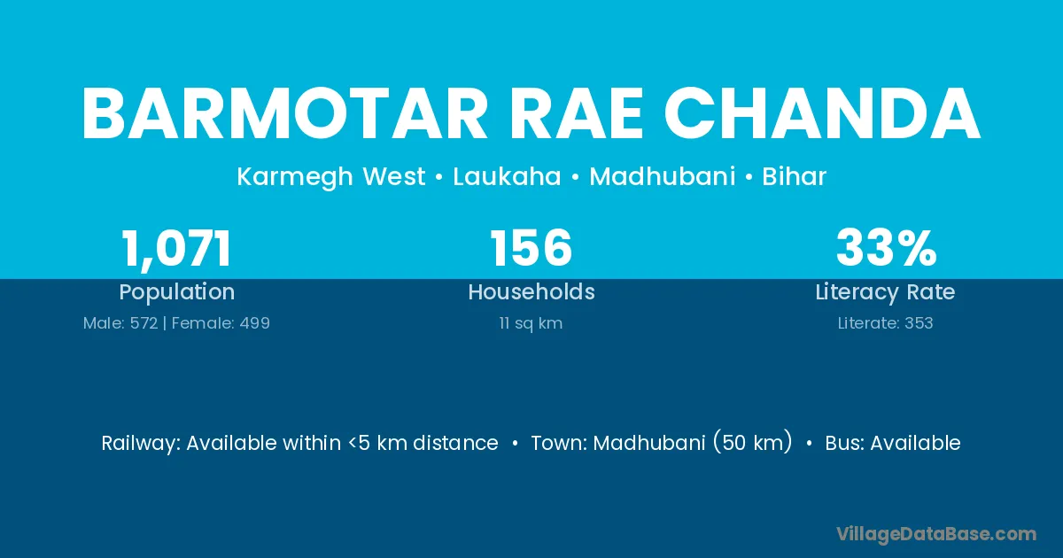 Madhubani (50 km) is the nearest town to Barmotar Rae Chanda village for major economic activities and is located approximately 50 km away.