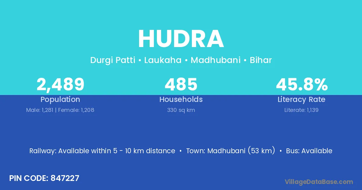 Madhubani (53 km) is the nearest town to Hudra village for major economic activities and is located approximately 53 km away.