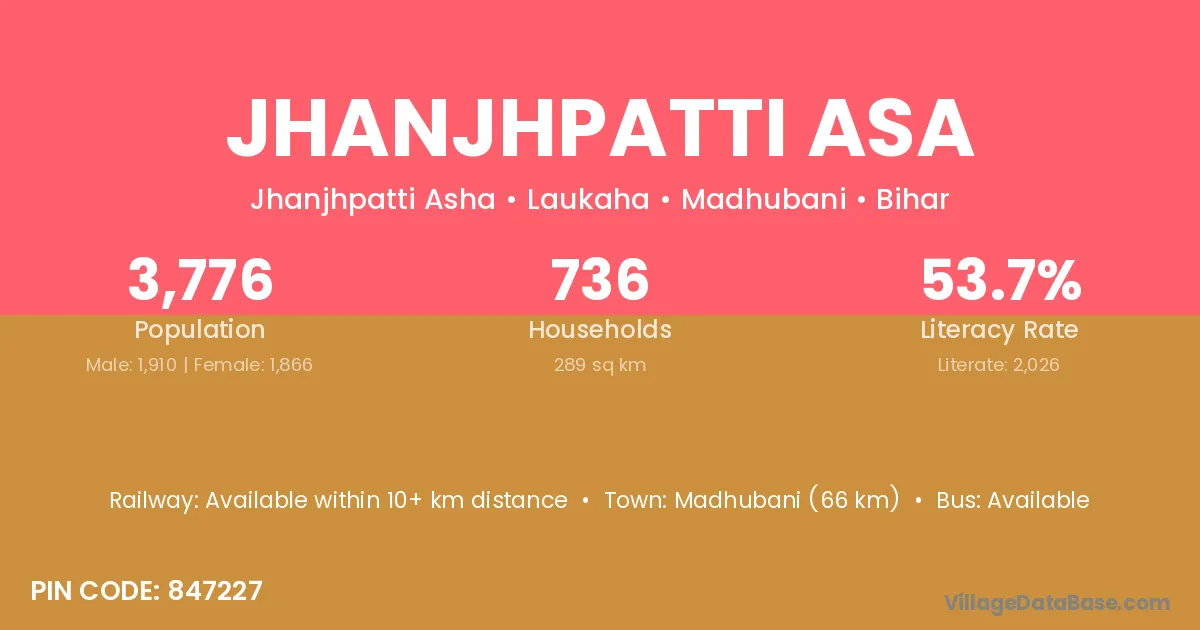 Madhubani (66 km) is the nearest town to Jhanjhpatti Asa village for major economic activities and is located approximately 66 km away.