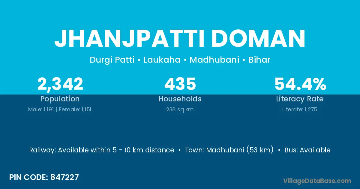 Madhubani (53 km) is the nearest town to Jhanjpatti Doman village for major economic activities and is located approximately 53 km away.