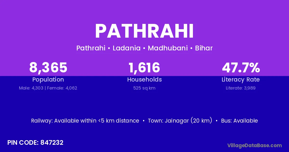 Madhubani (60 km) is the nearest town to Pathrahi village for major economic activities and is located approximately 60 km away.