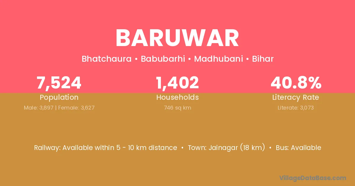 Ghoghardiha (35 km) is the nearest town to Baruwar village for major economic activities and is located approximately 35 km away.