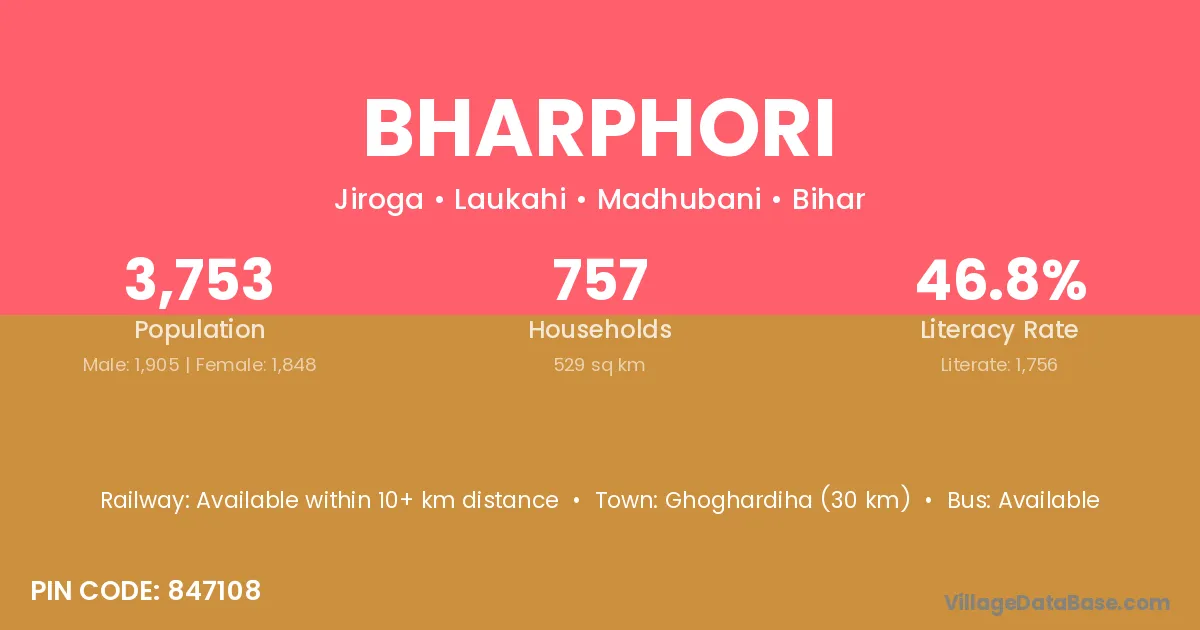 Ghoghardiha (30 km) is the nearest town to Bharphori village for major economic activities and is located approximately 30 km away.
