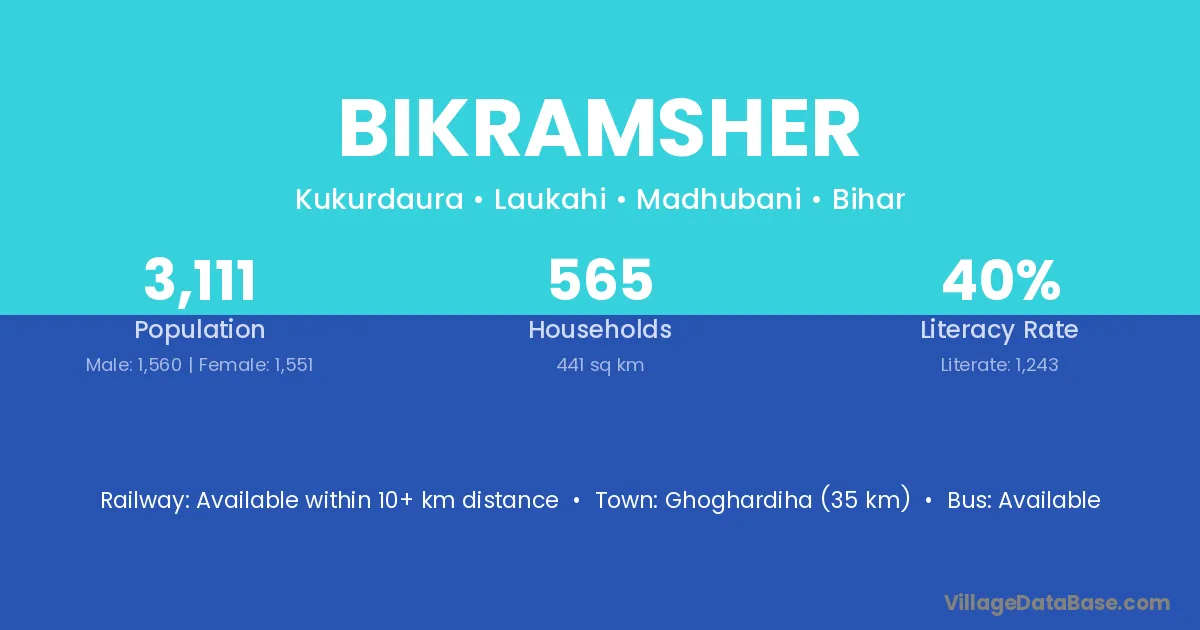 Ghoghardiha (35 km) is the nearest town to Bikramsher village for major economic activities and is located approximately 35 km away.