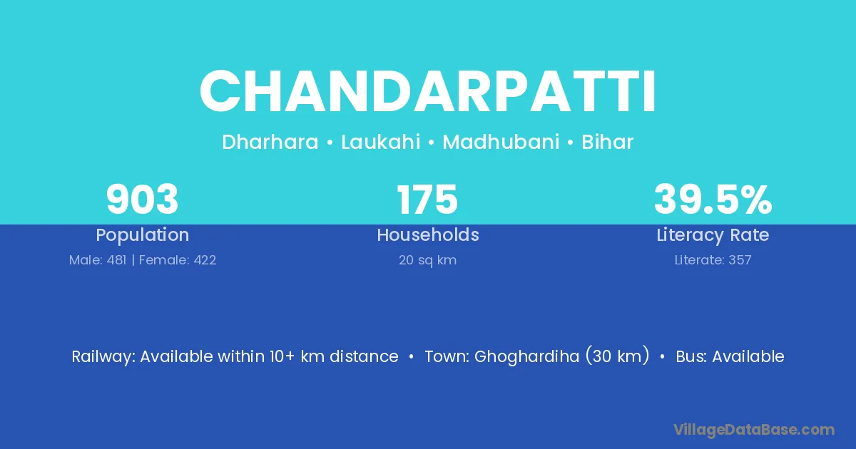Ghoghardiha (30 km) is the nearest town to Chandarpatti village for major economic activities and is located approximately 30 km away.