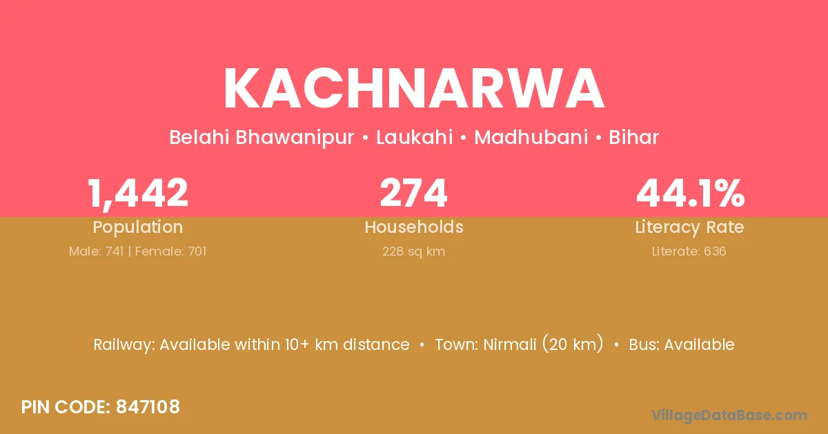 Nirmali (20 km) is the nearest town to Kachnarwa village for major economic activities and is located approximately 20 km away.