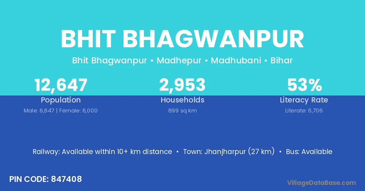 Jhanjharpur (27 km) is the nearest town to Bhit Bhagwanpur village for major economic activities and is located approximately 27 km away.