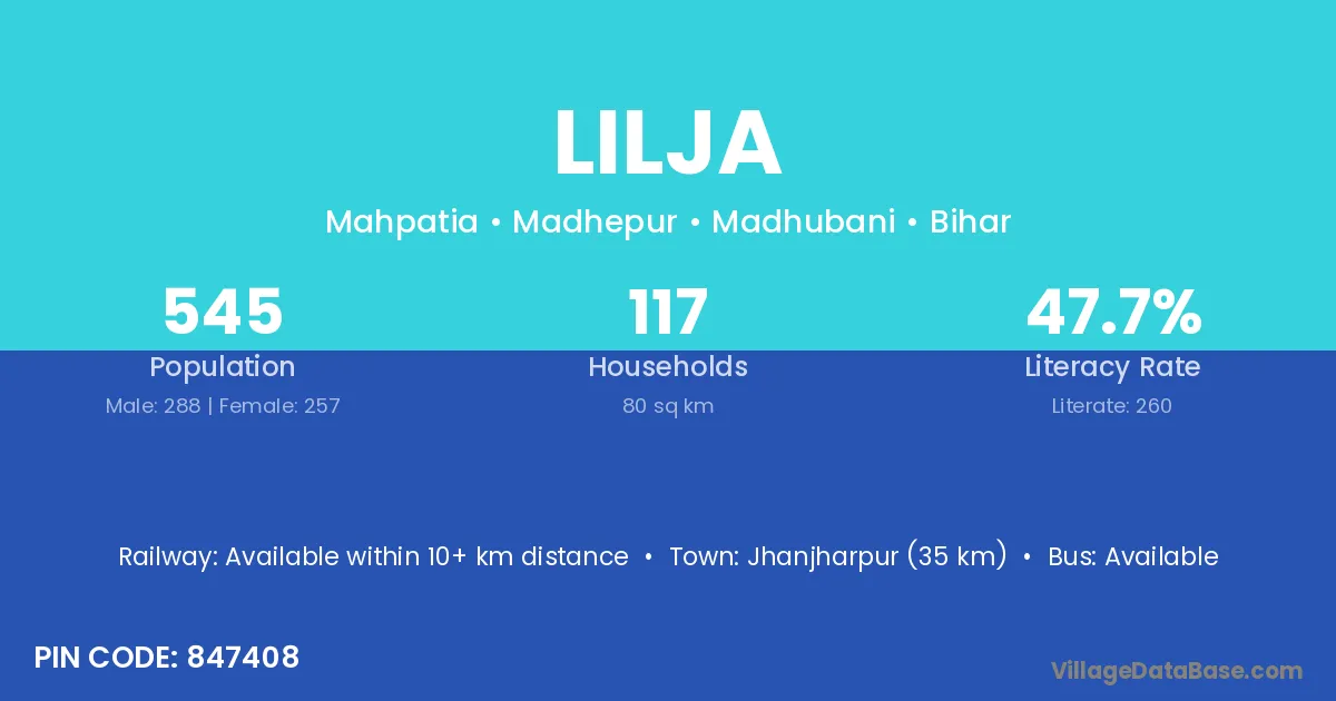 Jhanjharpur (35 km) is the nearest town to Lilja village for major economic activities and is located approximately 35 km away.